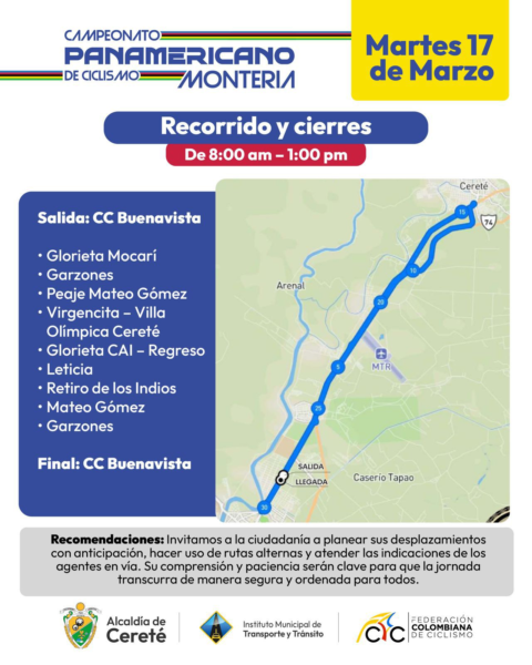 Con motivo del Campeonato Panamericano de Ciclismo de Ruta, que tendrá a Cereté como subsede, las autoridades de tránsito informan a la comunidad que este martes 17 de marzo se realizarán cierres viales temporales entre las 8:00 a. m. y la 1:00 p. m., con el propósito de garantizar la seguridad de los ciclistas y el adecuado desarrollo de la competencia.