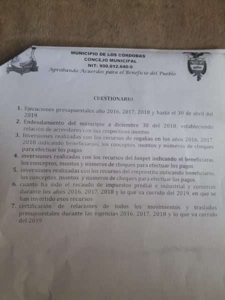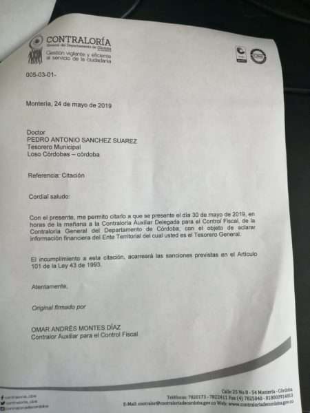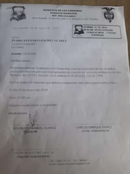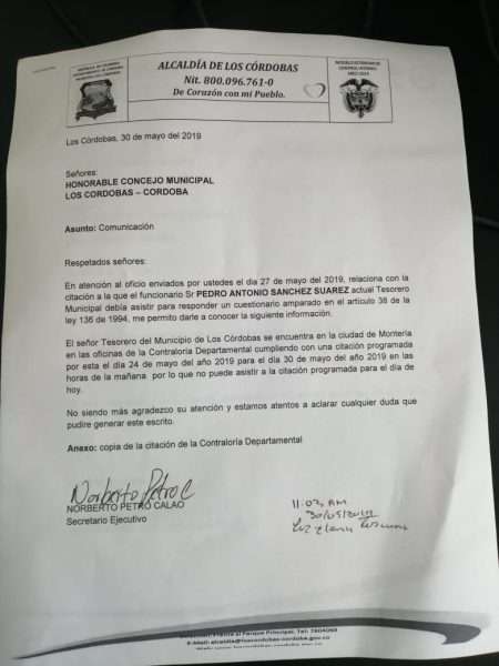 El Concejo de Los Córdobas se encuentra preparando una proposición de moción de censura contra, Pedro Antonio Sánchez Suárez, tesorero municipal, por no asistir a rendir informes financieros ni cumplir las citaciones del Concejo Municipal.