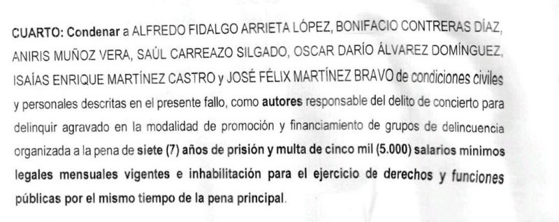 La providencia fue proferida por el Juzgado Octavo Especializado de Bogotá el día 9 de octubre del presente año, en la cual se condena a los señores: Alfredo Fidalgo Arrieta López, Aniris Muñoz Vera, Bonifacio Contreras Diaz, Isaías Enrique Martínez Castro, , Saul Carreazo Silgado, Oscar Dorio Álvarez Domínguez y José Feliz Martínez Bravo, a la pena privativa de la libertad de siete (7) años de prisión y multa de cinco mil (5.000) SMLMV e inhabilitación para el ejercicio de Derechos y Funciones públicas, por los delitos de Concierto Para Delinquir Agravado en la modalidad de promoción y financiamiento de grupos ilegales.