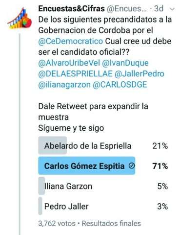¿De los siguientes precandidatos a la gobernación de Córdoba por el Centro Democrático, cuál cree usted debe ser el candidato oficial? Esa fue la pregunta planteada por Encuestas & Cifras a través de su cuenta de Twitter, donde el abogado Carlos Gómez Espitía se llevó por lejos el primer lugar.