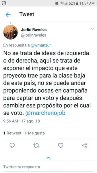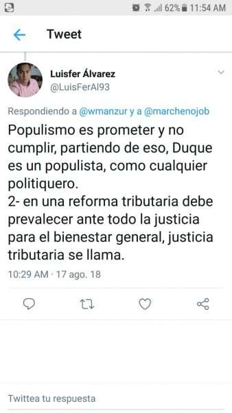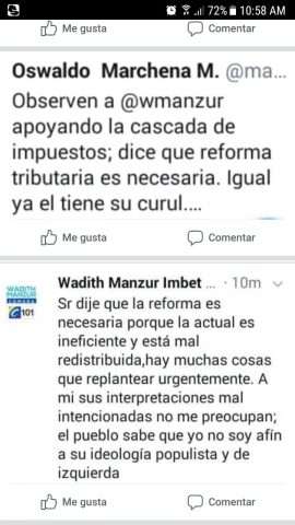 El rifi rafe en los trinos continuó y en la oportunidad muchos opinaron y le cuestionaron la actitud al hijo del exsenador, procesado por parapolítica, Julio Manzur, haciéndole ver su error ya que «en una Reforma tributaria no hay ni izquierda ni derecha». También le recordaron que» populismo es prometer y no cumplir como cualquier politiquero».
