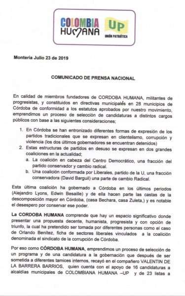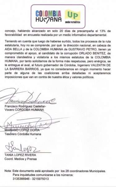 Esto, teniendo en cuenta que Córdoba Humana llevó a cabo los debidos procesos de la ruta estatutaria y ahora clandestinamente Petro y Bella dicen apoyar al diputado Benitez.
