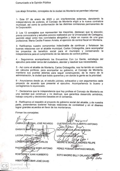 «Este 7 de enero de 2020 y sin interferencias externas, denotando la independencia de poderes, el Concejo de Montería eligió a la nueva Contralora Municipal, así como la conformación de las distintas comisiones permanentes de la Corporación», se lee en el comunicado.