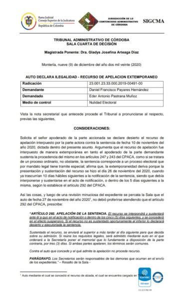 El Tribunal Administrativo de Córdoba declaró extemporáneo el recurso de apelación interpuesto por Daniel Francisco Payares, contra la sentencia que negó las pretenciones de la demanda de nulidad electoral contra el concejal Eder Pastrana.