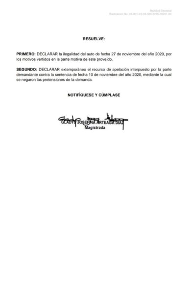 «La Sala advierte que, el escrito contentivo del recurso de apelación en el caso que se examinan fue presentado ante la Secretaría de esta Corporación el día 26 de noviembre de 2020, esto es, cuando ya había expirado el término con el que se contaba para la presentación oportuna del mismo», se lee en el documento.