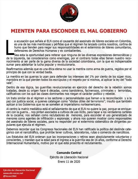 A través de un comunicado, el ejército de Liberación Nacional ‘ELN’, negó su responsabilidad con el asesinato a líderes sociales y reclutadores de menores de edad.