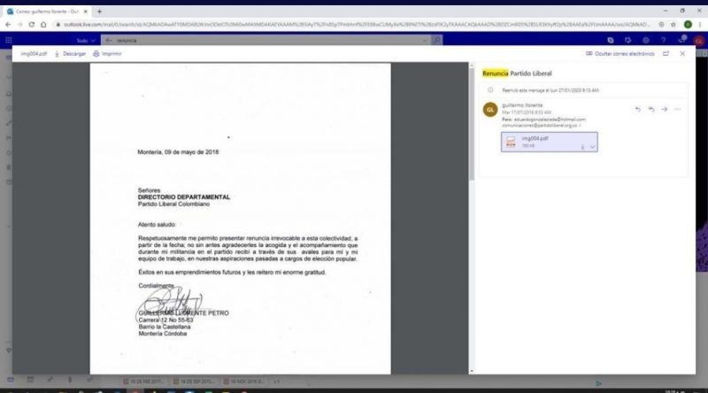 Actuando en consecuencia, Llorente Petro, Alcalde Demandado, ha acreditado en el estadio de su defensa procesal documentos que prueban su renuncia y el firme deseo de no seguir perteneciendo a la colectividad Roja. Lo ha hecho por los medios ordinarios, frecuentes y habituales, como las de envío de un correo electrónico a las instancias nacionales y departamentales del partido, tal como se evidencia en los anexos de la contestación de su demanda.