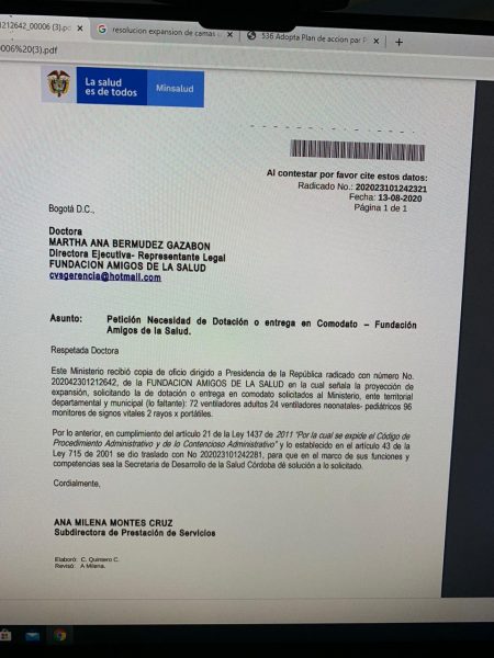 En este orden de ideas, la directora explicó que, el centro de salud, con fines de atender la emergencia en Córdoba, envió el plan de expansión, con todos los requerimientos: tecnología implementada, soporte técnico, contratación de talento humano, entre otras especificaciones.