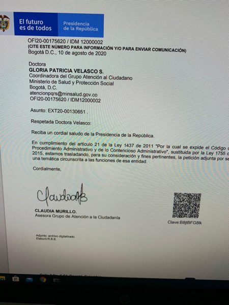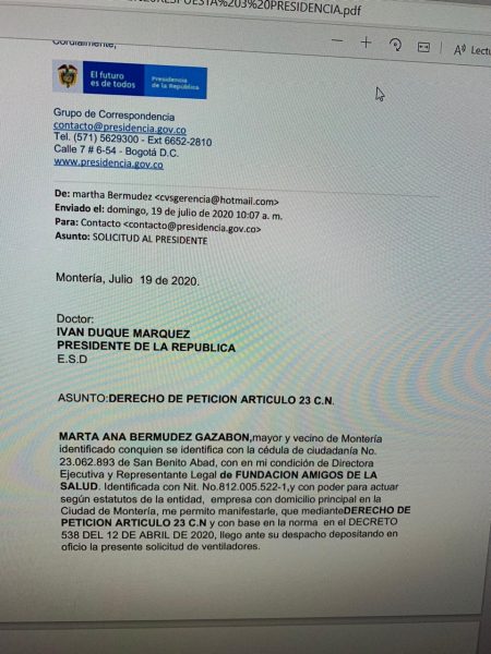 El jefe de Estado, transfirió el recurso al Ministerio de Salud, que a su vez lo envió al secretario de Salud departamental para que le diera solución, no obstante, según Bermúdez, no han recibido respuesta alguna.
