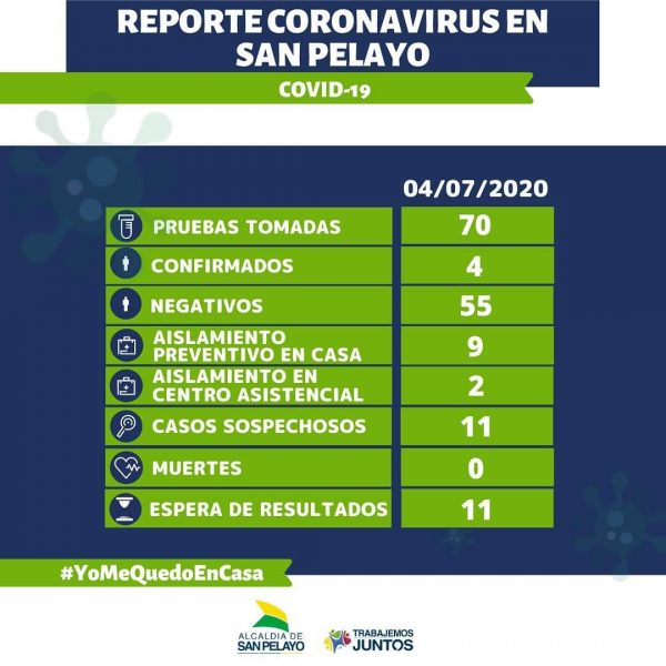 Desde la Alcaldía de San Pelayo emitieron un boletín en el que revelan el comportamiento del Covid-19 en dicha localidad, donde a la fecha se han confirmado cuatro casos positivos de la pandemia.