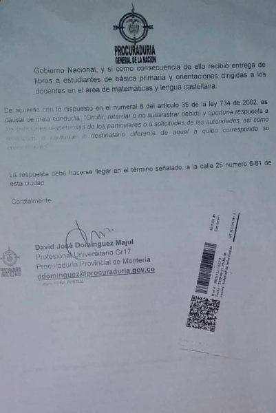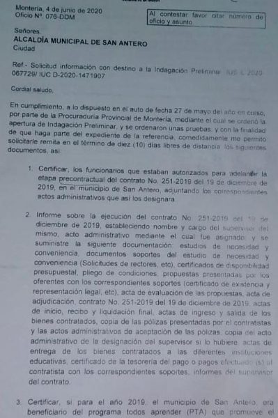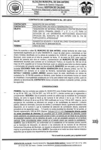 Se trata de la “adquisición de material pedagógico (textos educativos para básica primaria grado 1, 2, 3, 4 y 5) para la dotación de las diferentes instituciones educativas oficiales del municipio de San Antero con el fin de fortalecer el aprendizaje”, el cuál fue suscrito con Ediciones para una Nueva Generación, en el término de cinco días.