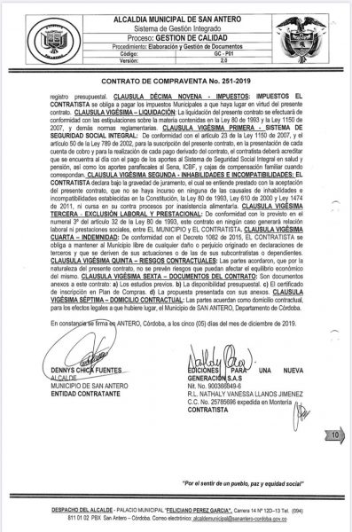Como prueba de ello un denunciante que prefirió no revelar su identidad, nos concedió uno de los últimos millonarios contratos que suscribió Chica Fuentes 12 días antes de culminar su periodo como alcalde el pasado 19 de diciembre del 2019, el cuál es por casi 600 millones de pesos.