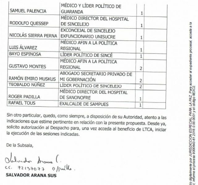 La Lengua Caribe conoció los nombres de los 22 testigos que están en la propuesta de aporte a la verdad que el exgobernador de Sucre, Salvador Arana Sus, le presentó a la Sala de Definición de Situaciones Jurídicas de la Jurisdicción Especial para la Paz (JEP)