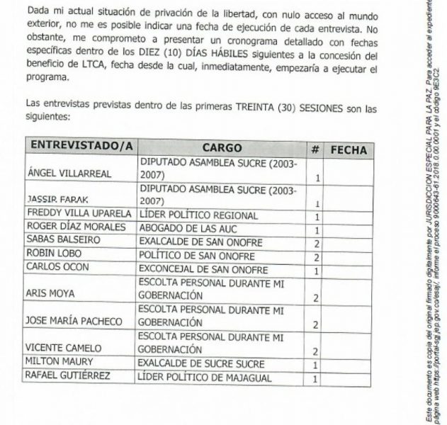 Con esta iniciativa, busca complementar el aporte preliminar a la verdad. Como se recordará el exgobernador de Sucre fue condenado a 40 años por el crimen del entonces alcalde de El Roble, Eudaldo León ‘Tito’ Díaz Salgado.