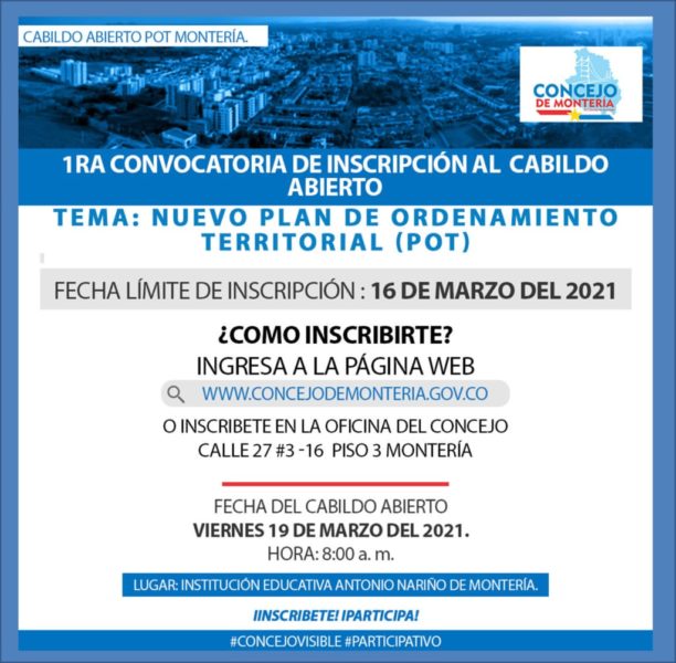 El cabildo abierto donde los ciudadanos podrán conocer en detalle el nuevo Plan de Ordenamiento Territorial, se llevará a cabo el próximo viernes 19 de marzo del 2021 en las instalaciones de la Institución Educativa Antonio Nariño de la ciudad de Montería a partir de las 8:00 A.M.