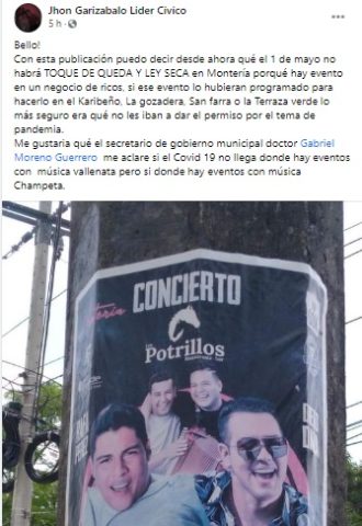 Uno de los comentarios que más causó eco, fue el de un líder comunal, quien cuestionó la rigurosidad en las medidas, pues según lo manifestado, la autoridad parece no actuar para los eventos que organiza la élite monteriana, mientras que se estarían ensañando con las actividades nocturnas que se llevan a cabo en el sur de la ciudad.