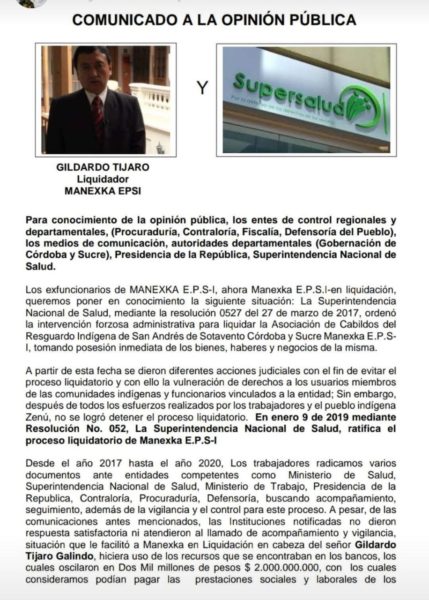 Preocupados se encuentran los exfuncionarios de la EPS indígena Manexka, toda vez que no les han sido cancelados sus salarios pendientes desde la liquidación de la empresa prestadora de salud.