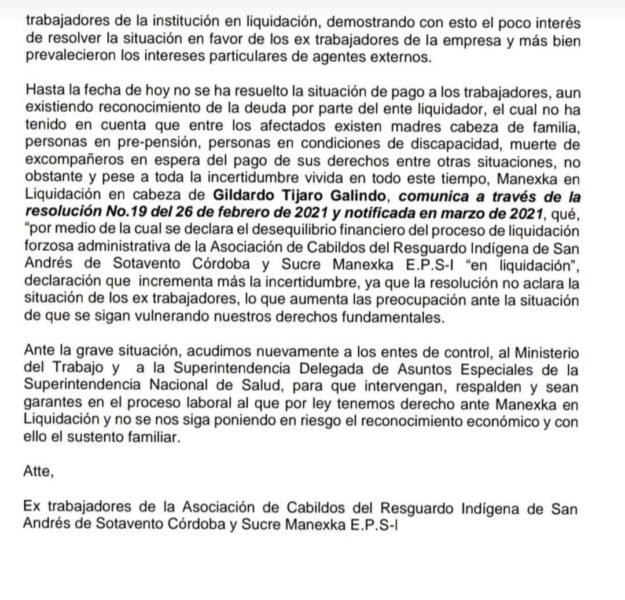De acuerdo con un comunicado emitido por los afectados, desde el año 2017 que inició el proceso liquidatorio, radicaron varios documentos ante las entidades competentes, solicitando acompañamiento y vigilancia en el mismo.
