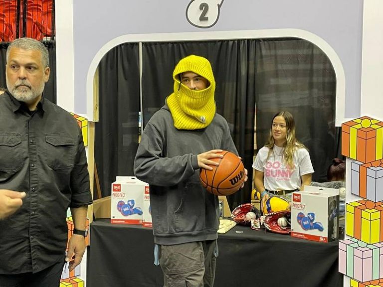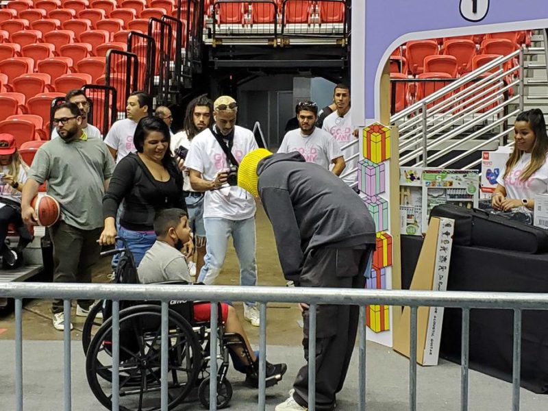 “¡Muchas felicidades!”, fueron las únicas palabras que ofreció Bad Bunny a la prensa, mientras continuaba repartiendo los regalos, incluyendo las pelotas de baloncesto, de las cuales algunas tomaba en sus manos y comenzaba a rebotar sobre el suelo.