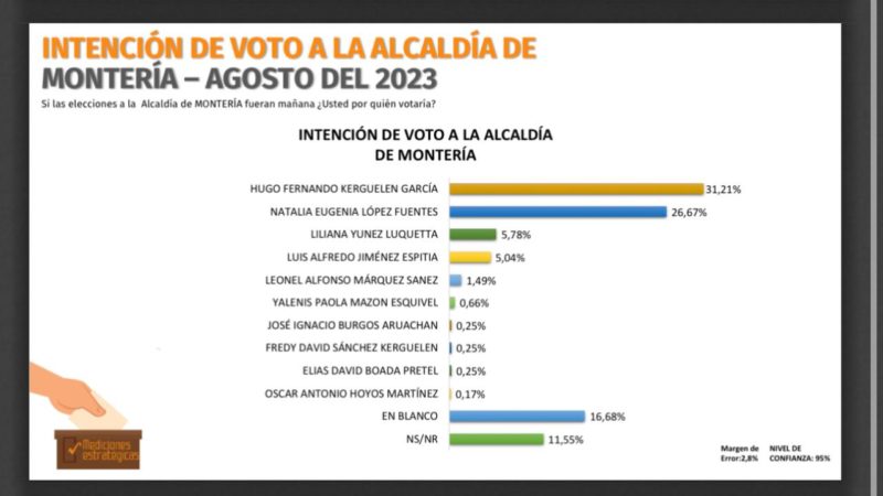 Hugo Kerguelén García sería el ganador si las elecciones para escoger alcalde en Montería fueran mañana. Así lo revelan los resultados de la Gran Encuesta del Caribe, de agosto de 2023, realizada por la firma Mediciones Estratégicas y contratada por Canal Cartagena y Banda 115 de Tigo Une.