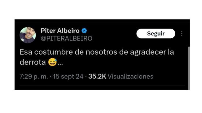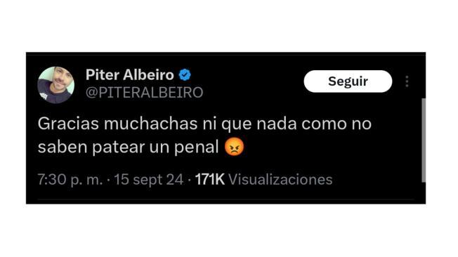 El comediante Piter Albeiro criticó duramente a las jugadoras en su cuenta de X, generando opiniones divididas: «Esa costumbre de nosotros de agradecer la derrota», escribió inicialmente.