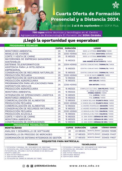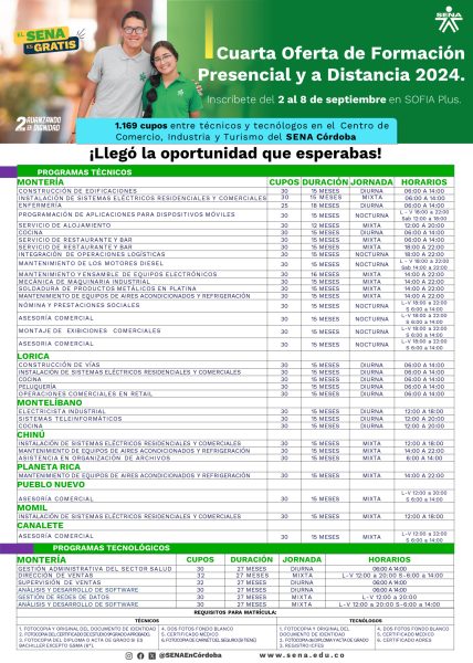 “Son más de 1.800 cupos distribuidos en 57 técnicos y 9 tecnólogos de nuestros centros de formación. Aprovecha esta oportunidad de avanzar en tus sueños, tenemos programas de gran demanda laboral como enfermería, cocina, programación de aplicaciones para dispositivos móviles, entre otros”, expresó Clara Genes Bitar, directora (e) regional SENA Córdoba. Pensando siempre en sus aprendices, el SENA ofrece varias jornadas: diurna (6:00 a.m. a 6:00 p.m.), nocturna (6:00 p.m. a 10:00 p.m.), madrugada (10:00 p.m. a 6:00 a.m.) y mixta (combinación de dos jornadas).