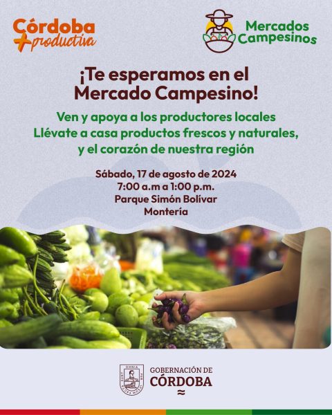 El gobernador de Córdoba Erasmo Zuleta, invitó a todos los cordobeses para que apoyen a los productores del departamento que vienen de los municipios del departamento, “no dejes de apoyar a nuestros productores locales que traen sus productos frescos, de buena calidad y sobre todo con el cariño de los campesinos. Te esperamos este sábado en el Mercado Campesino Córdoba Más Productiva”.